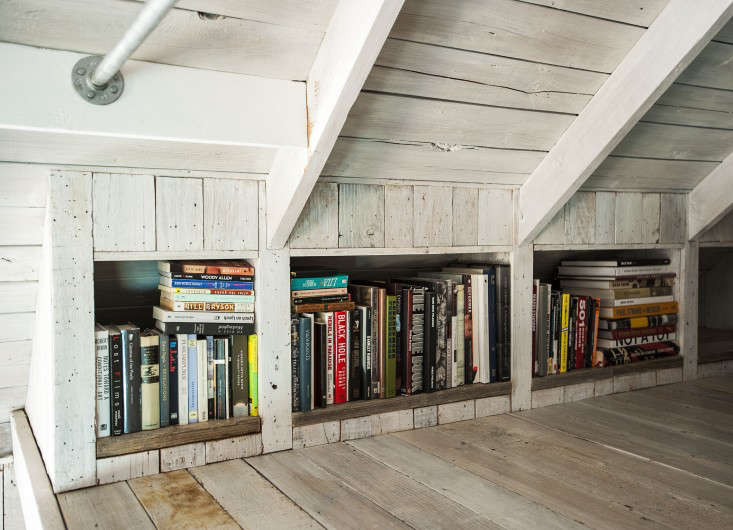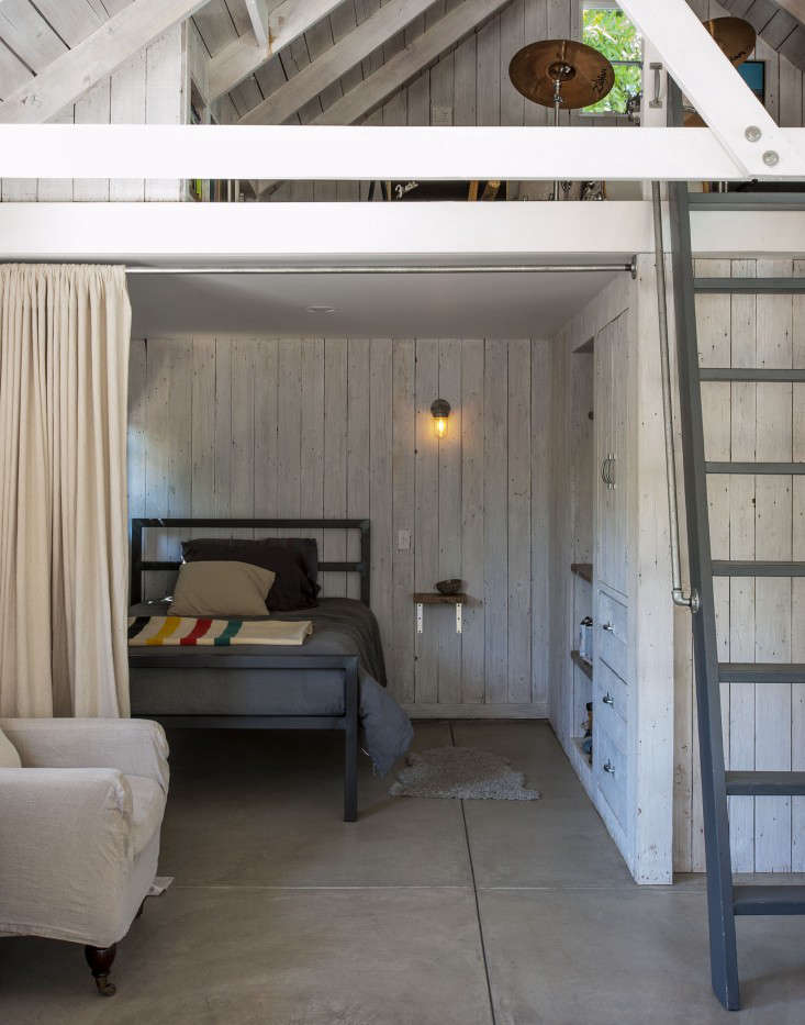 Above: Pays and Bernsen entirely lined the interior of the workshed with scrap wood siding from a now defunct salvage dealer. They whitewashed it by painting it (Benjamin Moore Simply White–“with a brush not a roller,” specifies Pays, “I like to see the strokes”) and then rubbing it with a rag. They upgraded the old concrete floor with a new layer of poured concrete. And built a mezzanine level; Corbin himself hammered the wooden ladder with metal railing that leads to it. The finished interior is spacious enough for a hangout area, plus side-by-side bedrooms.