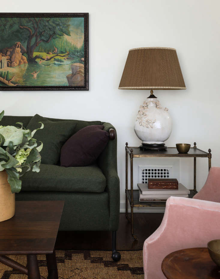 Above: The furnishings are a mix of craftsman-made, modern-heirloom pieces and vintage, all selected for scale and comfort–and to look collected over time. BDDW’s Abel Sofa is the first thing you see when you walk in the door. It’s paired with Sawkille’s Penn Coffee Table and a vintage Tuareg mat found on Etsy.