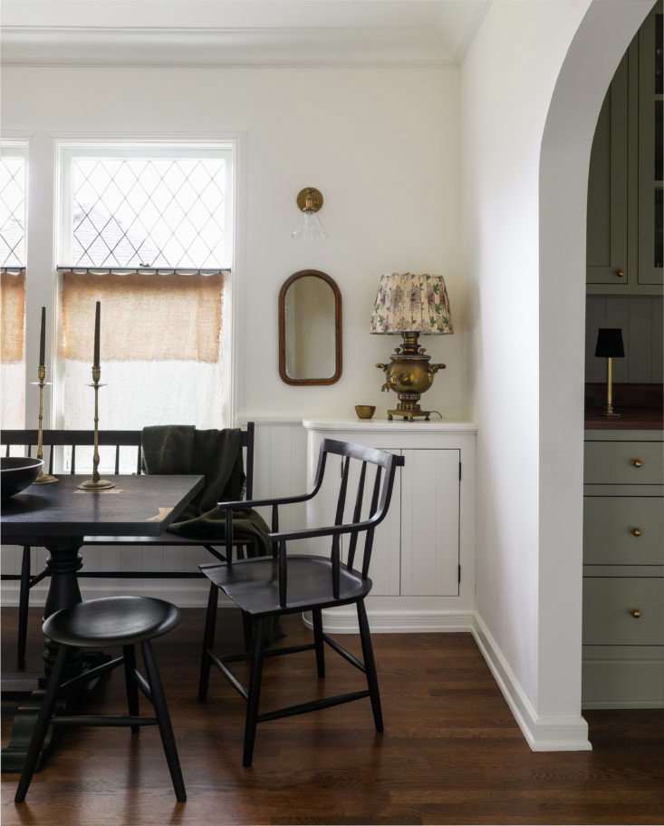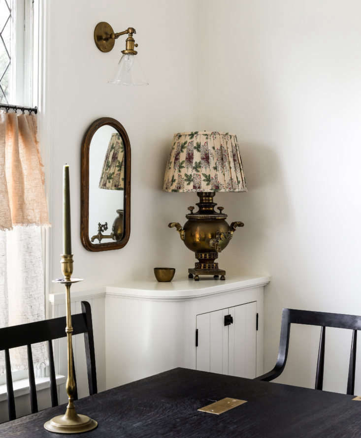 Above: The built-in corner cabinet is a new addition—”it mimics what was in the living room,” says Caillier. Note the use of antique brass candlesticks and fanciful old lamps, such as this converted samovar.