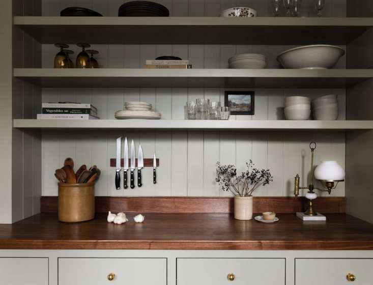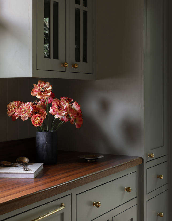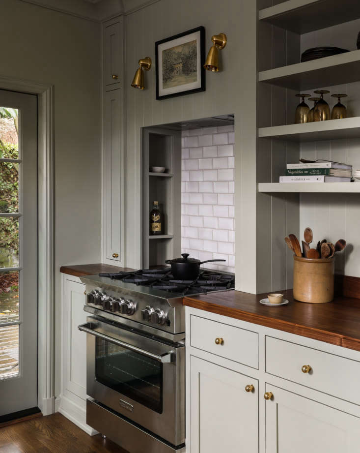 Above: The custom galley kitchen references designs by leading UK design firms deVol and Plain English. The cabinets and walls are painted the same color—Farrow & Ball’s French Gray—and the counters are walnut. The brass Ball Knobs and Massey Drawer Pulls from Rejuvenation work well with the Waterworks gooseneck Henry faucet.