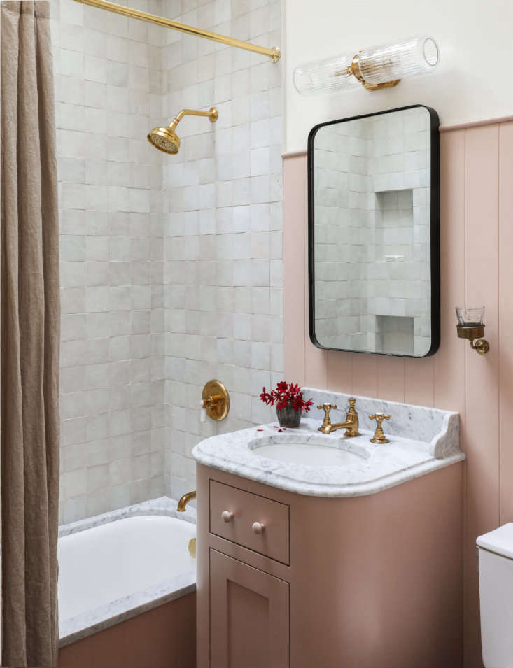 Above: The same vertical paneling applied in the kitchen appears in the overhauled tiny main bath, where a custom pink vanity stands alongside a five-foot-long tub, all painted Farrow & Ball Setting Plaster. “Because it’s all the same color,” says Caillier, “everything looks integrated and makes the space feel larger than it is.”