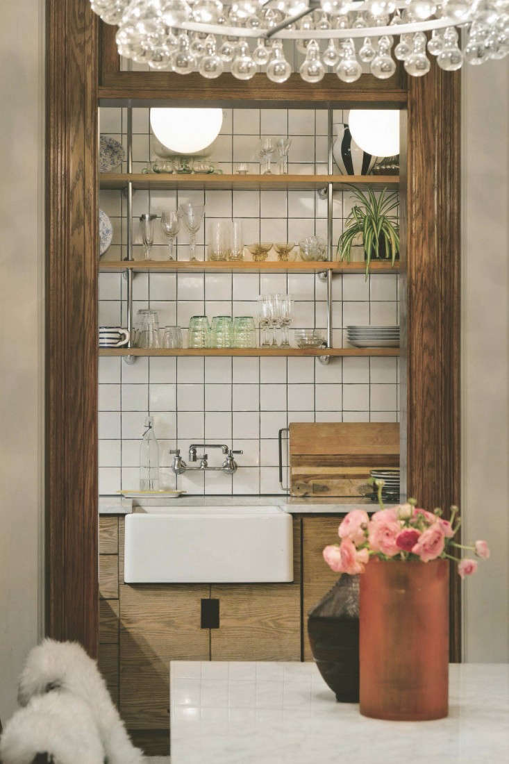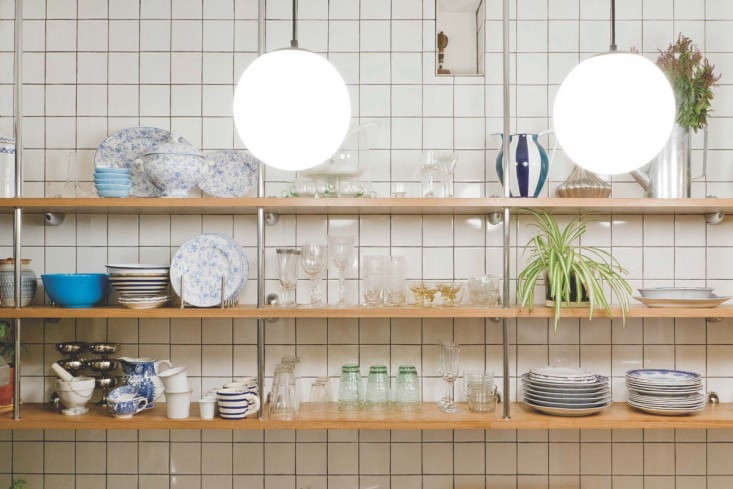 Above: Barbara (who owns Sorelle Firenze with her sister) requested the open shelves; they’re supported by Chrome Rods from Hafele. The globe lights are the Luna design from Schoolhouse Electric.