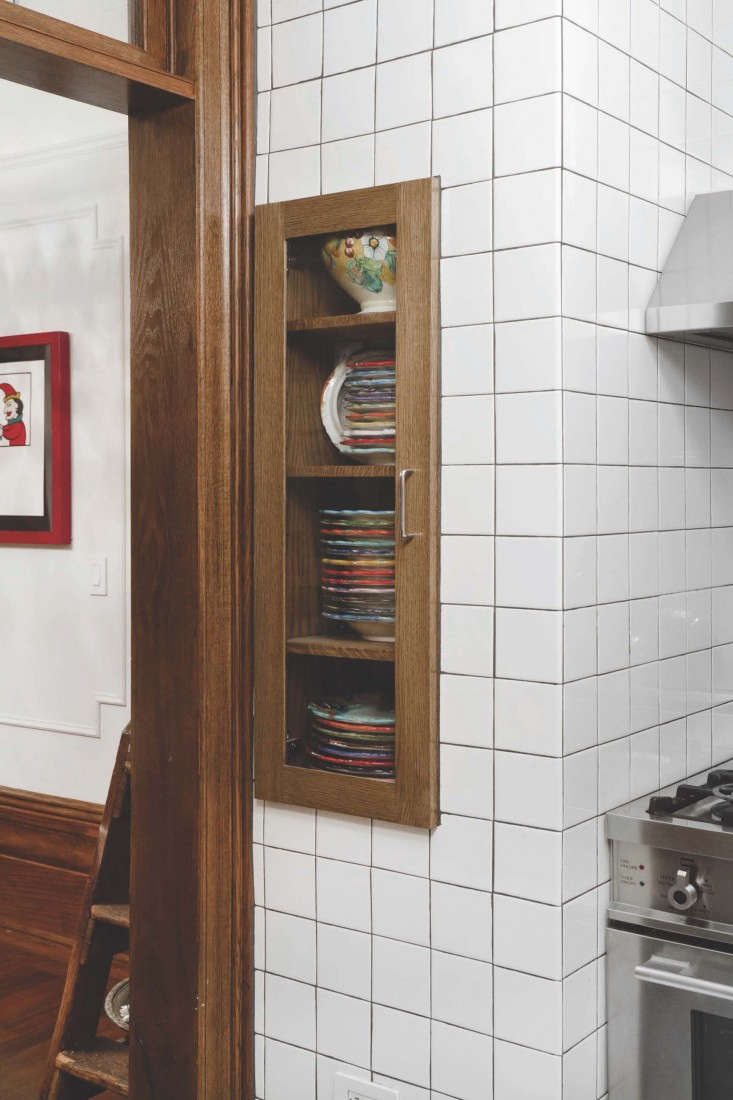 Above: Wegel turned a dumbwaiter into inset shelving: “Because of New York codes, we had to fireproof the hell out of that cavity.”
