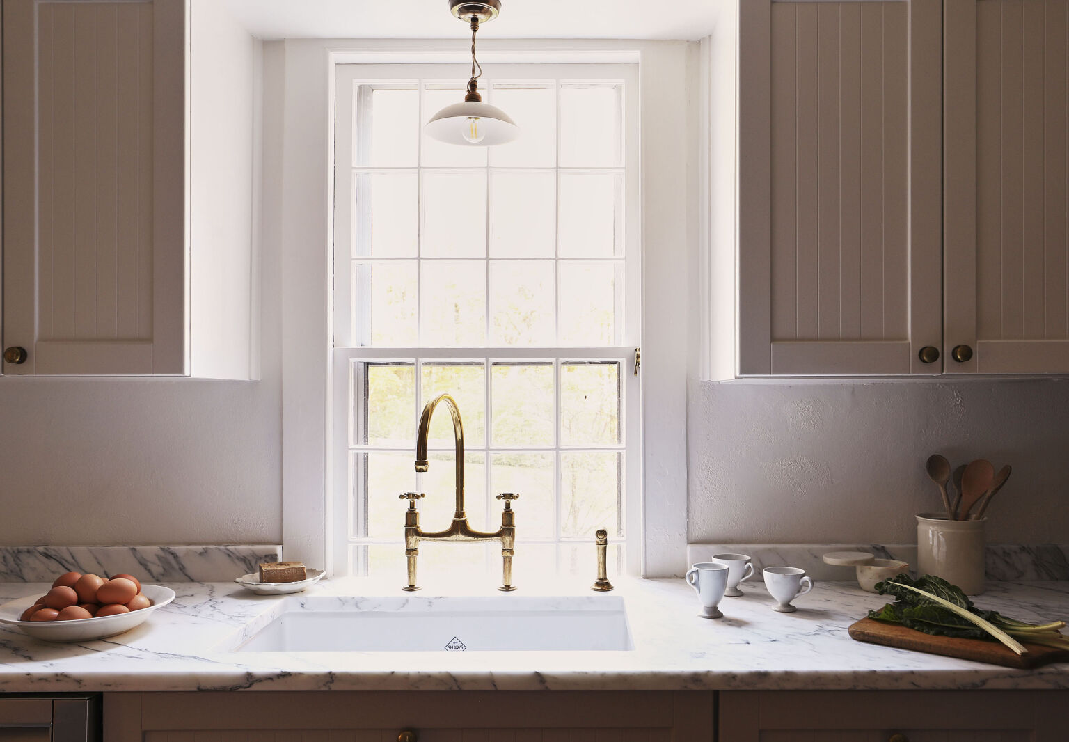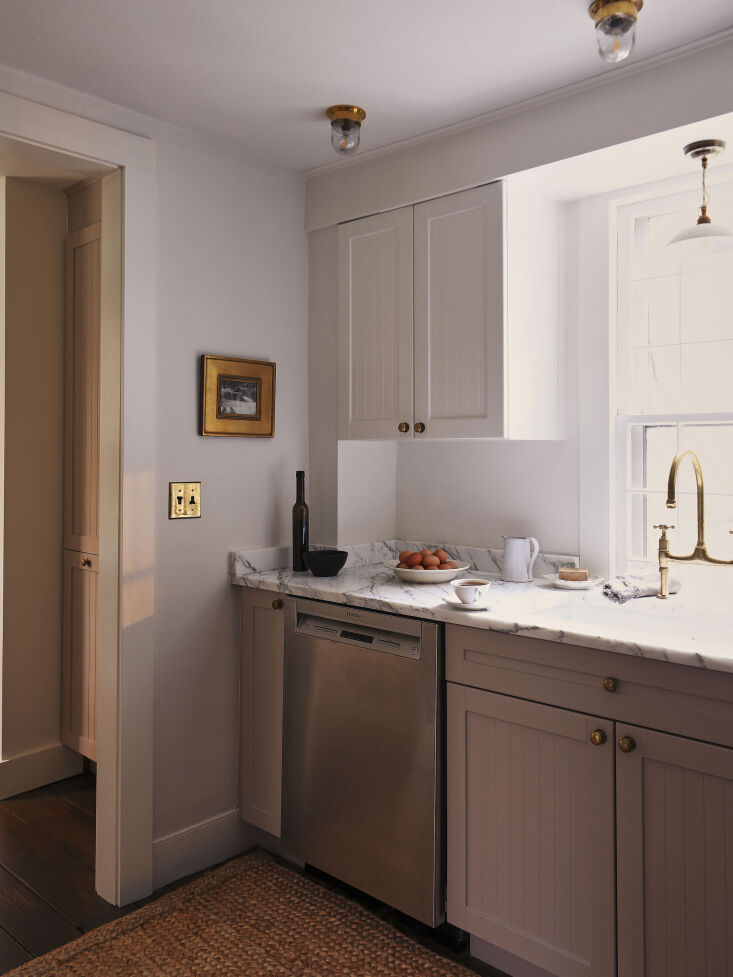 Above: Brittany simply painted the cabinets and kept the existing dishwasher and other appliances. But she splurged by replacing the sink with a Shaws fireclay basin and deVol bridge faucet; read about the one she chose in our post Found: The Perfected Aged Brass Kitchen Faucet. Equally significantly, she swapped out the red granite counter.,