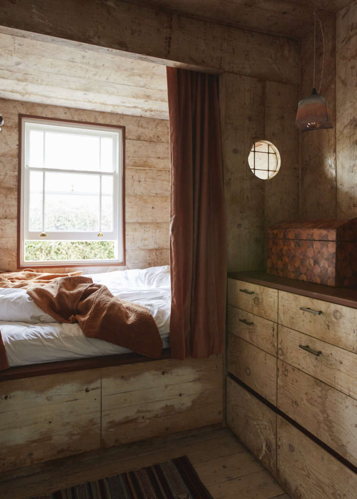 Above: In one of the guest rooms, the bed is set in a nook paneled in reclaimed pine cheese boards (a longstanding Retrouvius speciality, these were used for maturing cheeses, hence the faint circular patterns, but, Maria assures, are odor free). The cutouts are small glass windows.