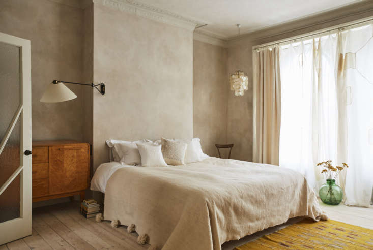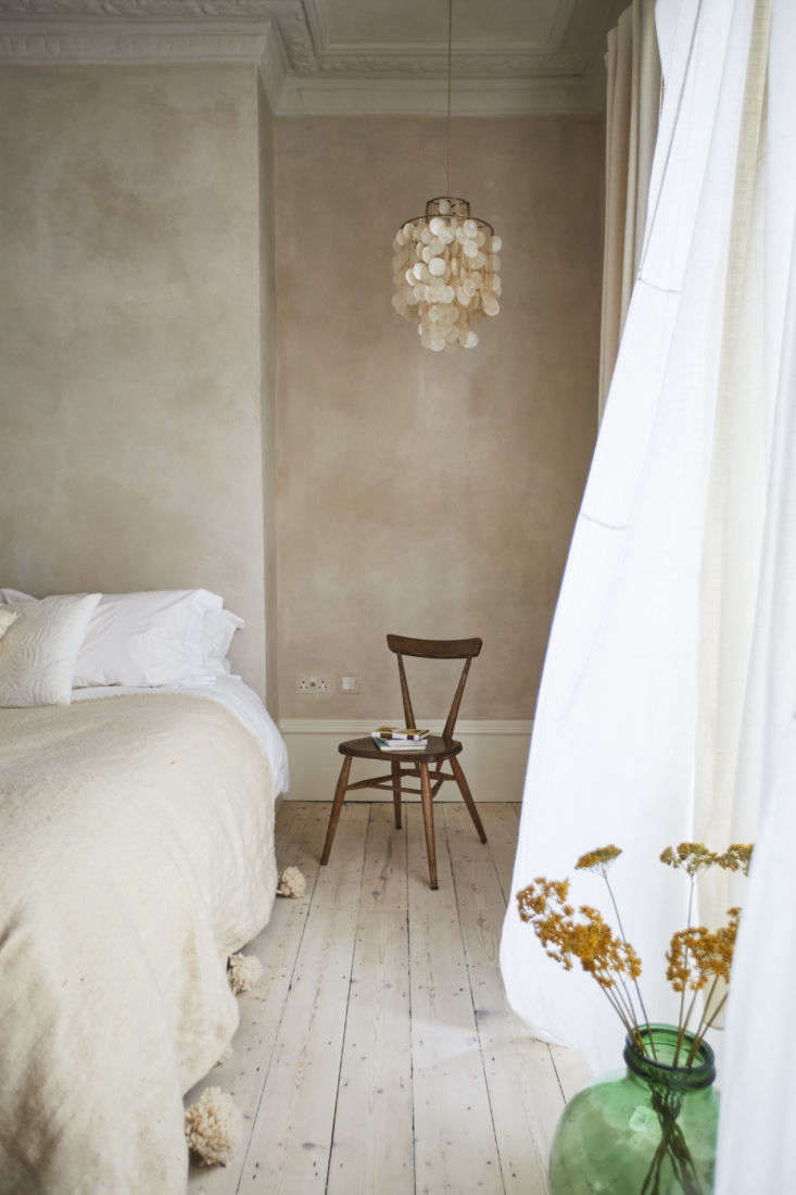 Above: The costumier loves living with old textiles, of course, but has an aversion to painted walls: as Maria puts it, “she feels a deep sense of gloom about flat emulsion.” To give the surfaces depth and nuance, the rooms are limewashed (learn about the finish in Remodeling 101: Everything You Need to Know About Limewash Paint).