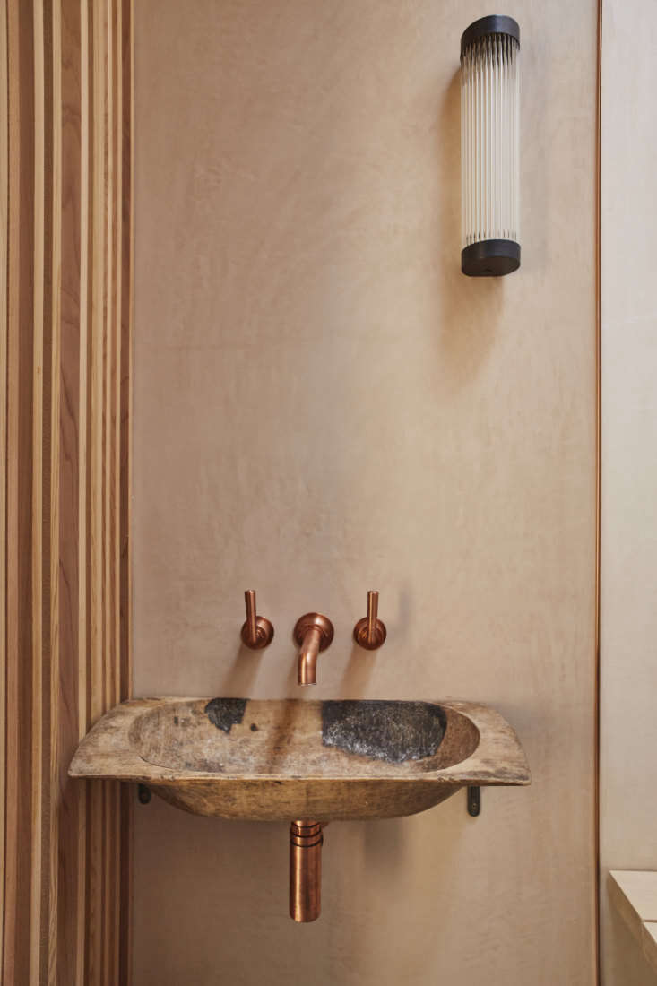 Above: The basin is made from an old wood bread trough. The copper fixtures are from Waterworks.