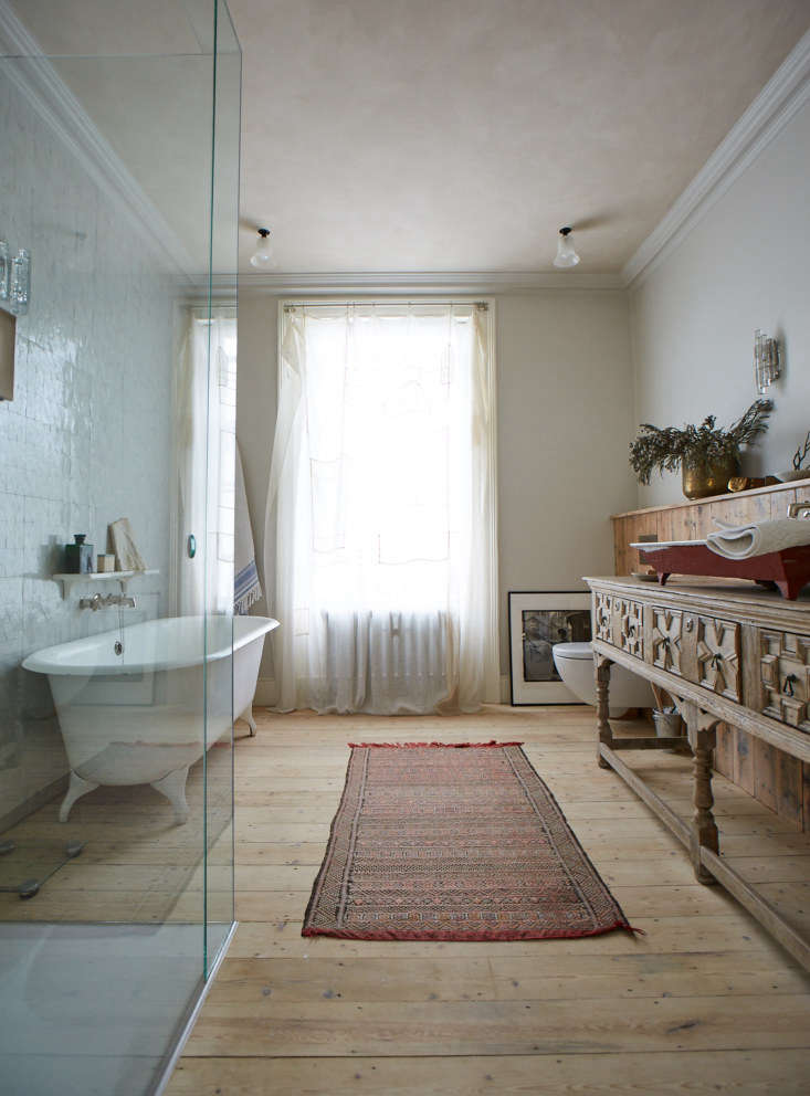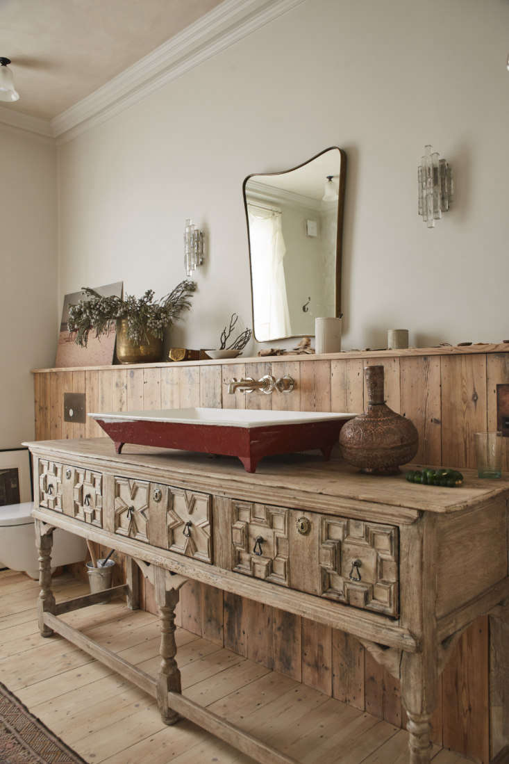 Above: An antique English sideboard serves as a washstand. (“A great place to look for English furniture is the Decorative Collective website, says Maria.) The vintage enameled sink came out of the Retrouvius warehouse: “We were using it to clean teacups and old light fittings,” says Maria. “Our client used it to explain what she envisioned and we realized the basin had found its new owner.”