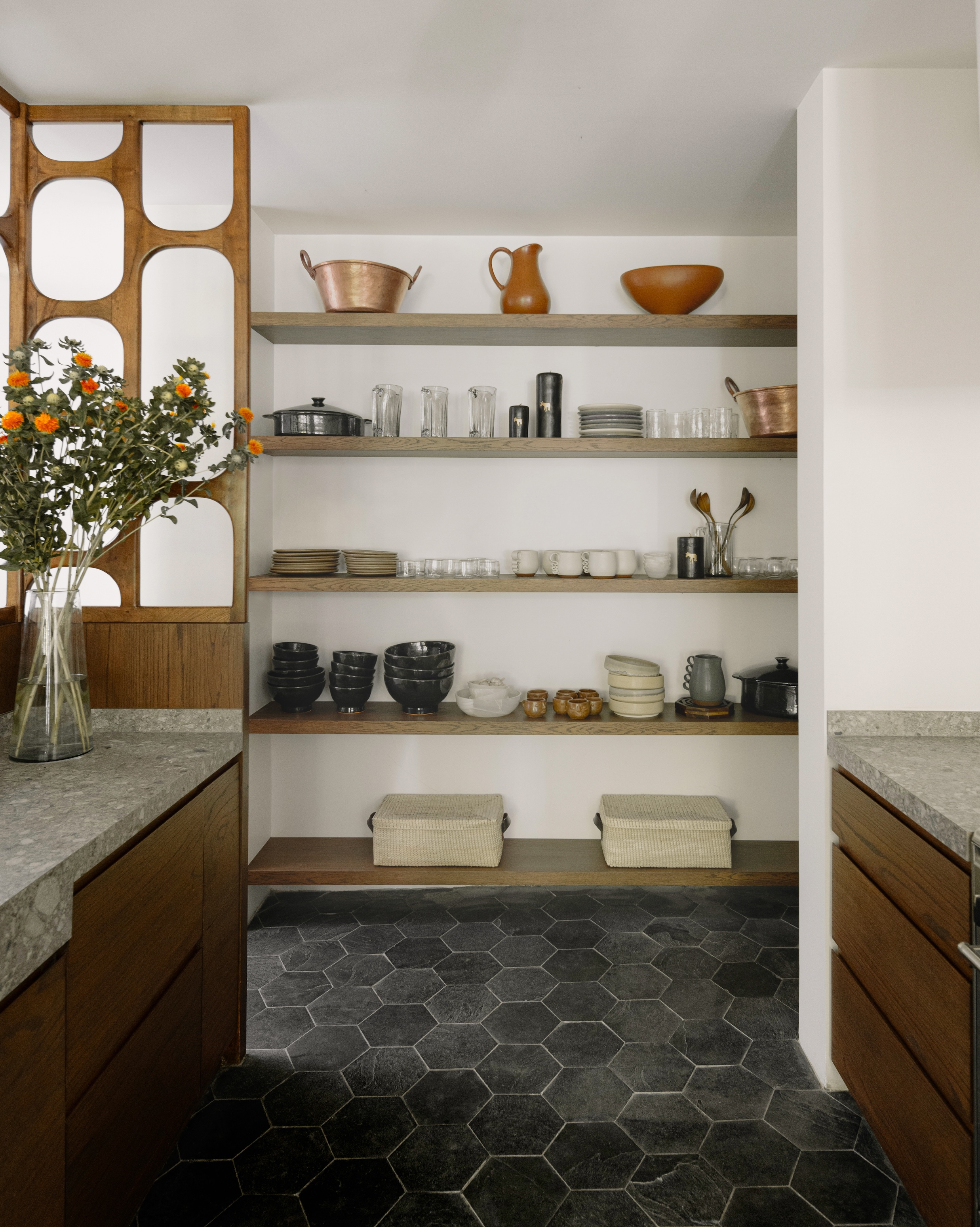 Above: “There were some things I had my heart set on and people humored me,” says Laura of the custom-cut hexagonal slate floor tiles made by a local stoneworker. Next to nothing in the apartment is off the rack: even most of the dishware on the open shelves are one-offs created for the space by L’Aviva Home artisans. Photograph by Maureen M. Evans.