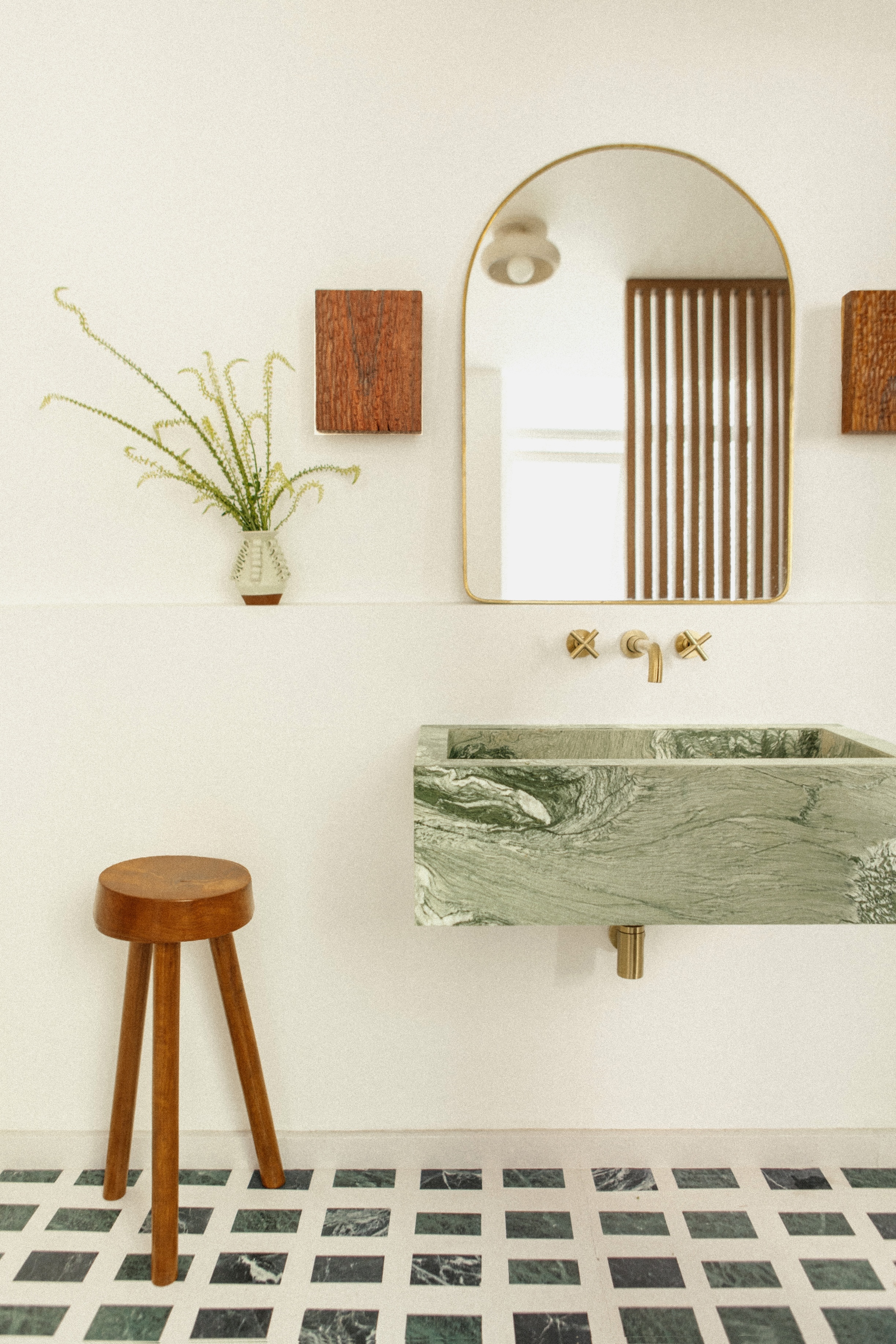Above: The baño huéspedes—guest bathroom set in the former maid’s quarters—has a terrazzo floor inlaid with Verdi Alpi marble, “a stone that was extensively used on CDMX city center building façades at the turn of the 20th century,” says Laura. The companion sink of Verde Luana marble was also custom made. The Lola Vase is by Mexico City star ceramic artist Perla Valtierra. Photograph by Maureen M. Evans.,