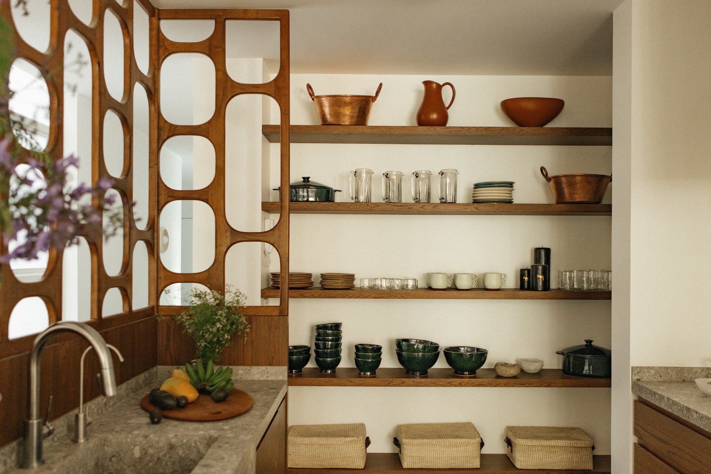 Above: The small kitchen now sits at the heart of the apartment divided from the living room by a mesquite screen carved by Isaac Castañeda, a third-generation woodworker in his twenties from Guanajuato who Laura was introduced to by a friend. Wanting a space that was partially open, Laura was inspired by screens and latticework in Mexican churches and Barragán’s architecture— “they’re used as a way of creating divisions and filtering light.” Photograph by Fabian Martinez.