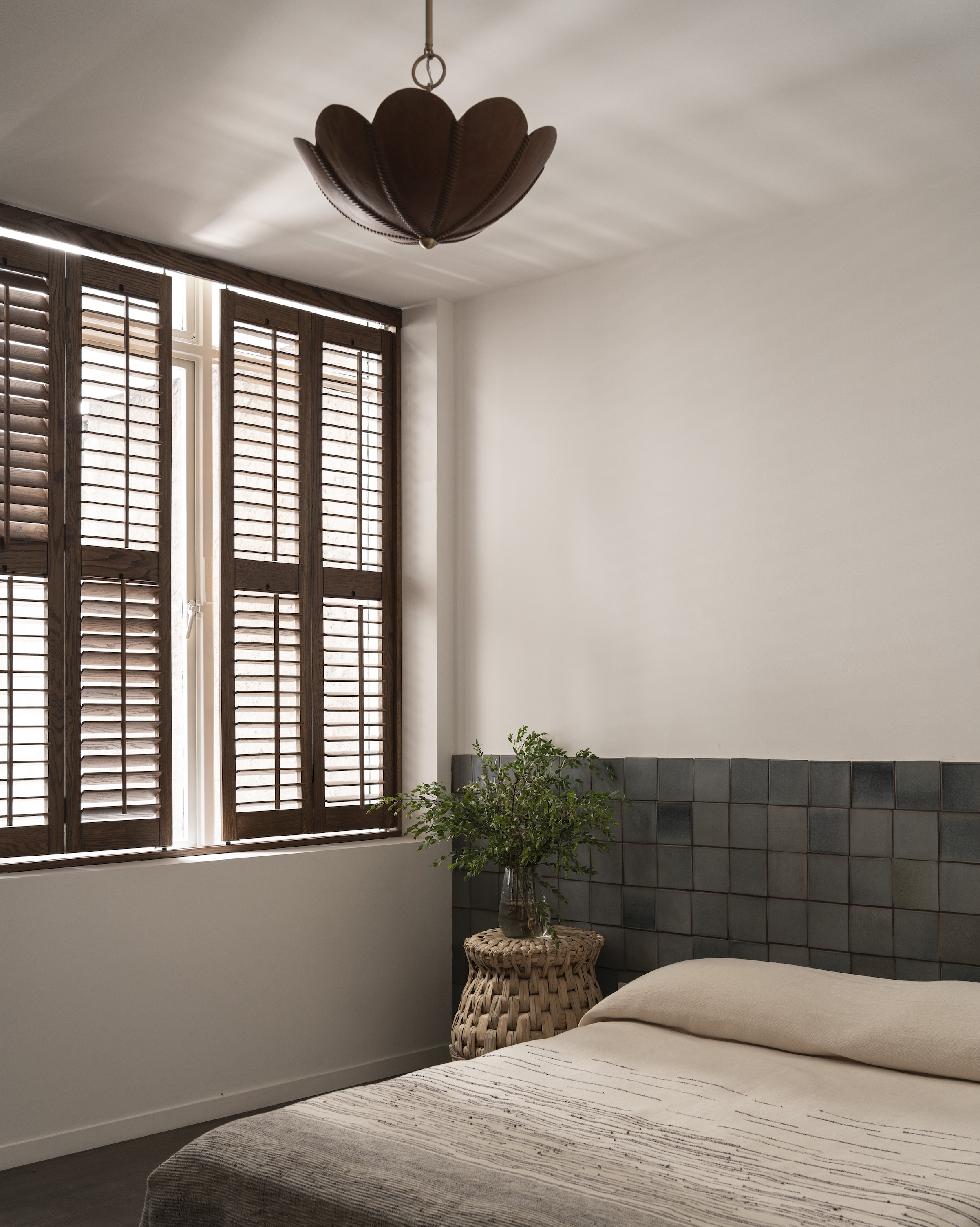Above: Laura commissioned Marina Santana, a ceramicist from Jalisco, to make her first tiles for behind the guest bed—”I don’t like headboards, so this is my nod to one,” says Laura. “I asked for shades of blue to add depth.” The Michoacán Collection bedcover of woven undyed wool and the saddle leather Capa Pendant Light are L’Aviva Home designs. Photograph by Fabian Martinez.