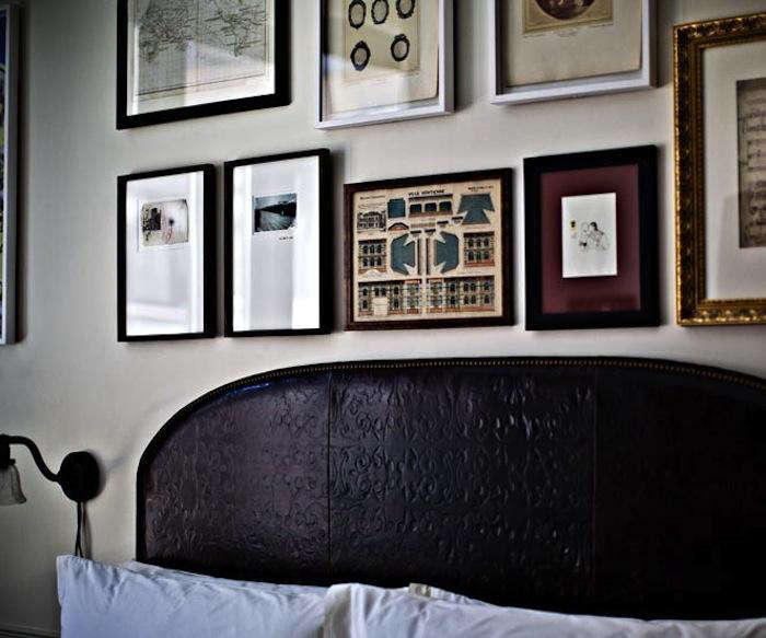 Above: The Parlor features dark oak, luxe fabrics, and 100 framed pressed antique herbs from the French heritage shop Deyrolle.