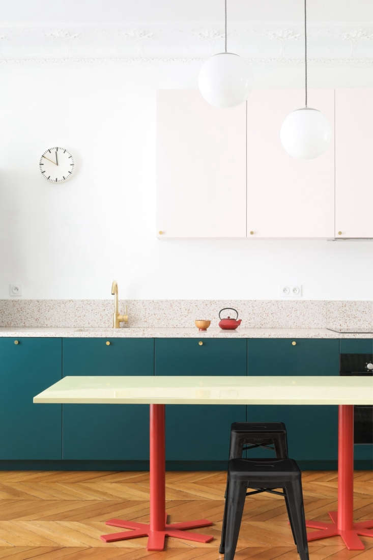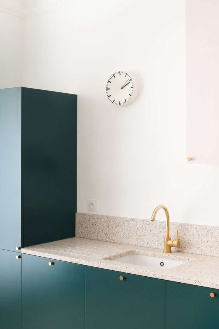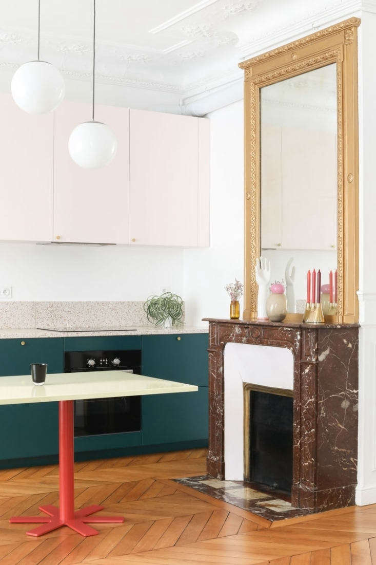 Above: The room’s original red marble fireplace and gilded mirror now stand against a color-blocked kitchen. “We designed the room as a graphic composition between vertical and horizontal rectangles,” says Julien.”We chose to use the same light pink as the living room ceiling, then we tried dark colors that contrast with it, and liked the way this green looks against the pink and terra-cotta.”