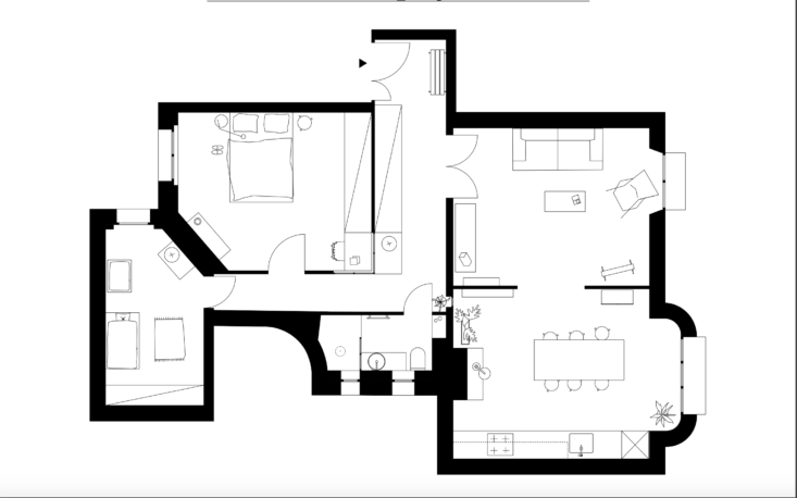 Above: The new floor plan—775 square feet in total—has a more logical flow, with the living room and kitchen/dining area linked and the bedrooms side by side in the back. The architects gained more space for the tiny bath by reducing the hallway a bit and sealing the door between it and the dining room. The construction took three and a half months.