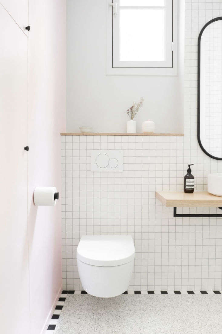 Above: Pale pink reappears on the entry wall. To keep the space feeling open, the architects selected a wall-hung Villeroy & Boch toilet and designed a birch ply shelf for the sink “so both are suspended and the floor is the main element.” The black hardware, toilet roll holder included, is from Paris department store Le BHV. The oval mirror is the Angui by AYTM.
