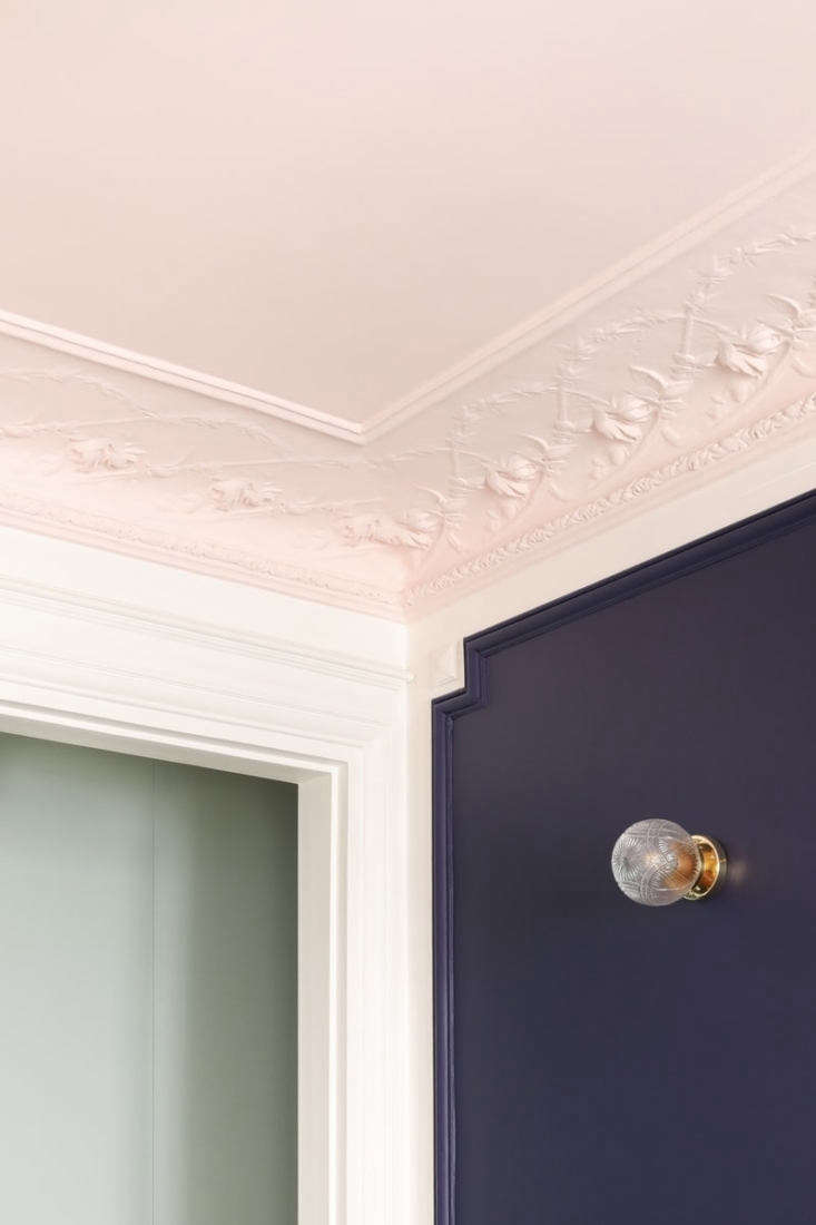 Above: The ceiling is edged with floral plasterwork cornices that verge on Art Nouveau, all now painted in Heju’s go-to Middleton Pink by Farrow & Ball.,