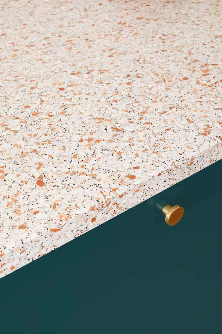 Above L: The cabinets were custom made for the space and painted “in the factory, so they’re strong and easy to clean.” The fridge is concealed to the left of the sink. Above R: The counter is terrazzo with terra-cotta fragments that match shades of the mantel.