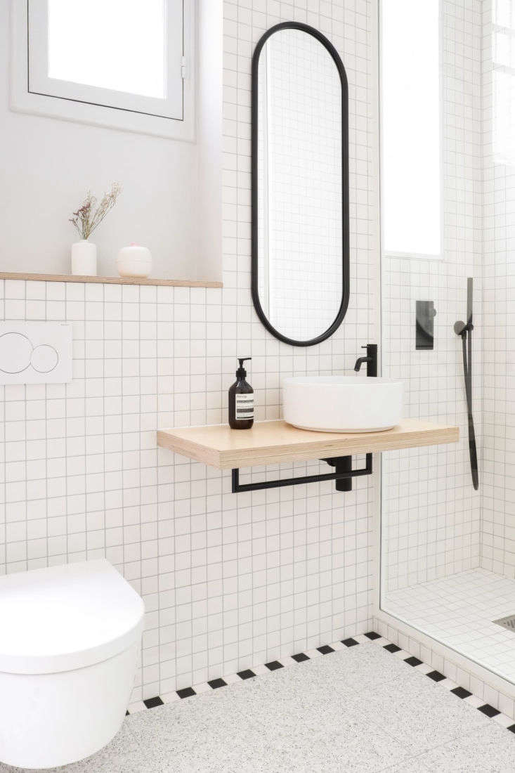 Above: “It’s a small bathroom, even for Paris, but it has two windows,” says Hélène. “We decided to create a Memphis-style design and to make the space look bigger, we defined two areas: the terrazzo floor, framed in black and white, is an echo of the kitchen countertop, this time in gray, and the walls are lined with square white tiles.