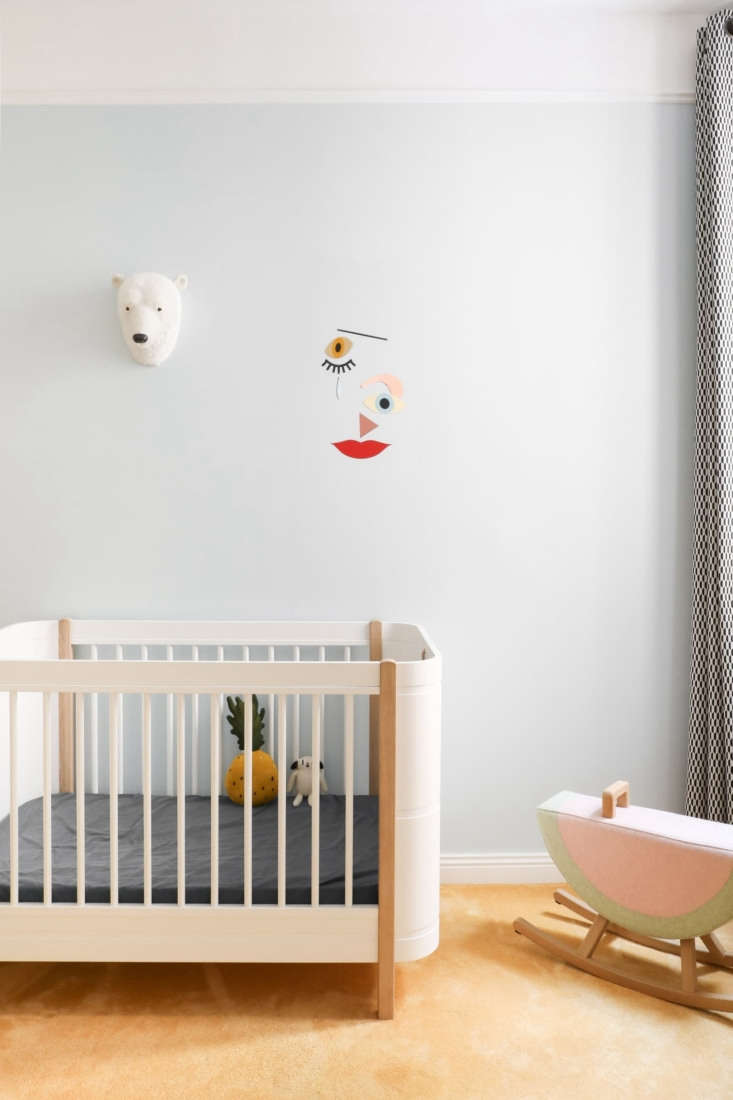 The light blue on the walls is Averse from Ressource: see Sexy Paint Colors from Paris. The crib is from Oliver Furniture of Copenhagen and the Wooden Expression Mobile is by Djeco.  The watermelon rocking horse is from Maison Deux.