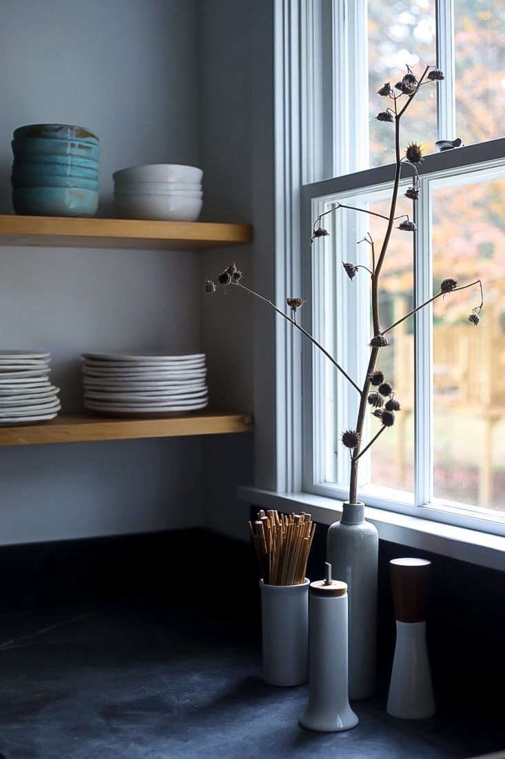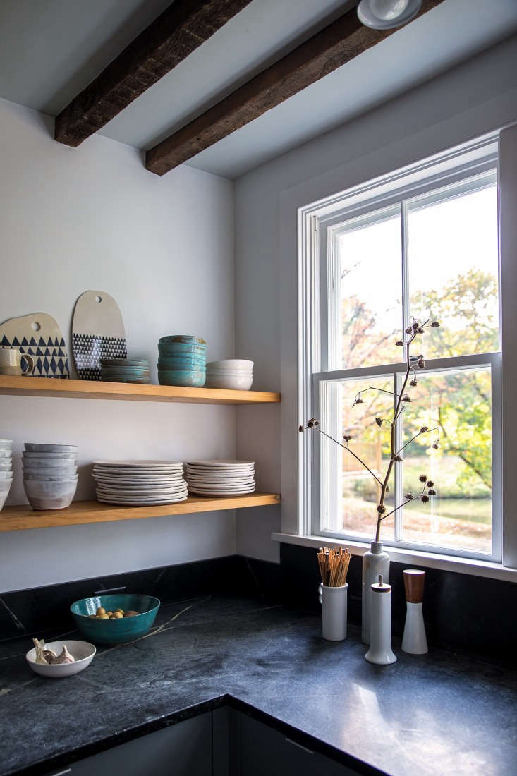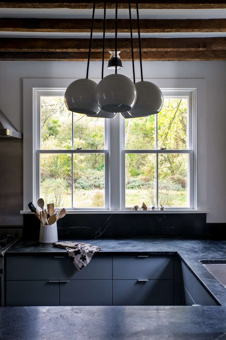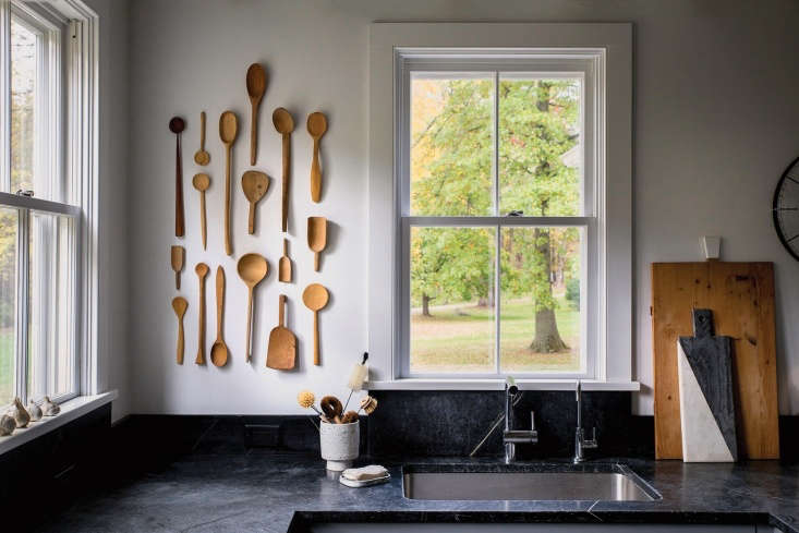 Above: For the dramatic dark countertops, Dunja chose traditional soapstone from Barra & Trumbore in Kerhonkson, New York. Her wooden spoon installation is comprised of vintage pieces procured on Etsy and eBay. Dunja, who is a textile designer as well as a potter, made the soap dish.
