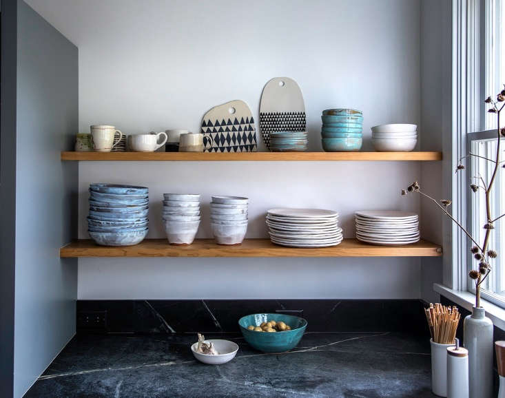 Above: Open shelving holds Dunja’s collection of dishes by Tivoli Tile Works. The geometric cheese boards are by Dunja (left) and Mbartstudios (right).