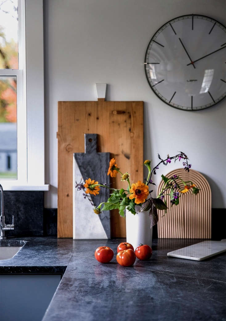 Above: Bounty from Dunja’s garden: Tomatoes and flowers add a bit of autumnal color. Against the wall rest a vintage cutting board, which Dunja bought at Brimfield, a two-toned marble board by Jonathan Adler, Hay’s Field Cutting Board (available at Finnish Design Shop; $60) and another smaller marble board from Hammertown in Rhinebeck. Leff’s Large Index Wall Clock is available at Lumens; $99.
