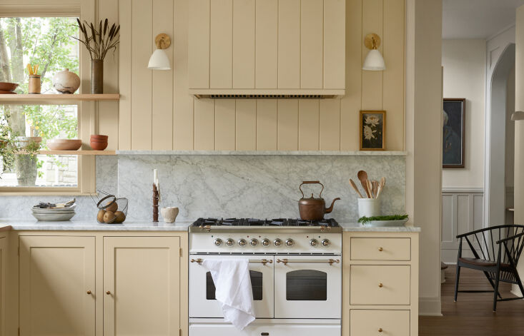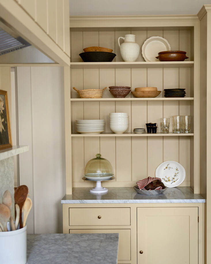 Above: A hutch-like built-in lends itself to the modern old-fashioned style of the room. The cabinets were all painted Farrow & Ball “Hay”; the walls are painted Farrow & Ball “Lime White.”