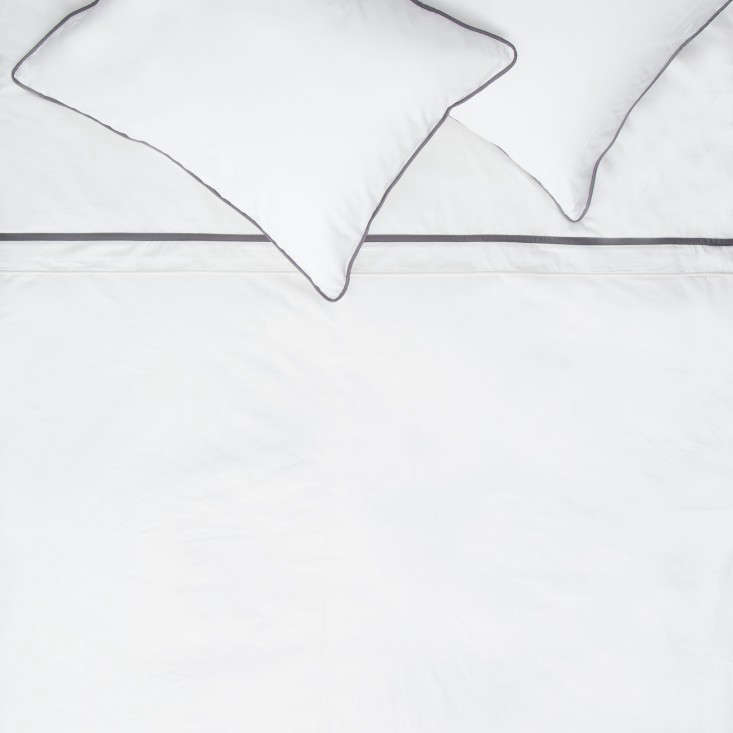 Above: The Bay Area’s Crane & Canopy was founded by Karin Shieh and Christopher Sun, a couple who met at Harvard Business School. They use the same overseas manufacturers as the high-end department store brands, but cut out the middleman to bring lower prices direct to consumers. There’s a lot of variety in the collection, and many of the patterns don’t speak to us. But simpler options can be found, such as the basic 400-Thread-Count Sheet Set, $149, and the Hayes Nova duvet, shown above in soft white with dark gray piping; $209 for a queen duvet and two shams.