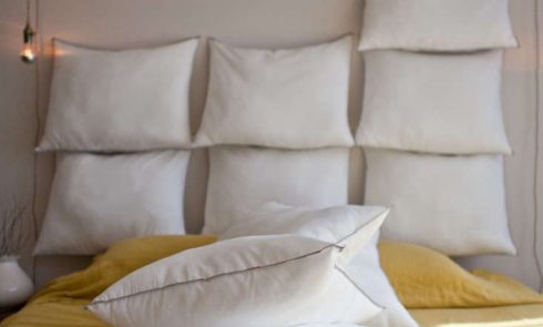 Above: Shades of red can look restful. Pool Suites have painted headboards and Lana Launay hanging lights.