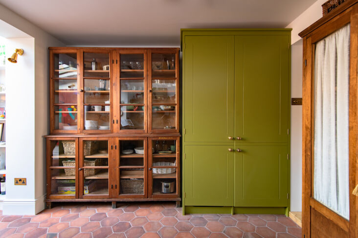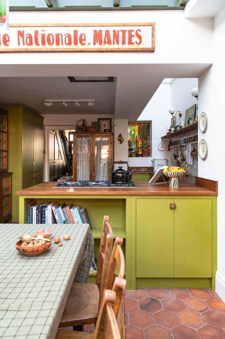 The couple worked with Darren Oldfield Architects to create a space that is “loved, worn, and rustic—only with modern elements.” Adds Charlotte: “We wanted the room to feel as though it had been there for years.” An admirer of the laid-back restaurant interior at The Pig Hotel, which gives “this feeling of being in an antique potting shed”, Charlotte assembled an earthy cast of materials including vintage apothecary dressers, handmade terracotta tiles, graffitied Iroko work surfaces, and wonky zellige tiles. These are held in balance by the clean, simple lines of British Standard Cupboards, which have a fresh snap of Citrine by Little Greene.