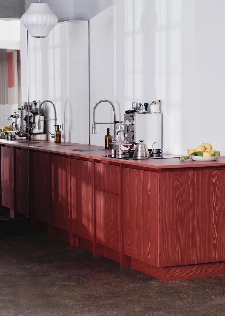 Above: A deep red linseed oil pigment from Linolie & Pigment (Bilbao) was applied to compact kitchen concept designed by Kóre Projects for Studio 11:40.