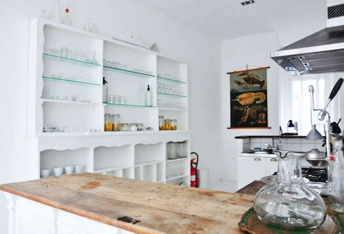 Above: The large kitchen features a wood work counter, botanical prints as decor, and glass open shelving.
