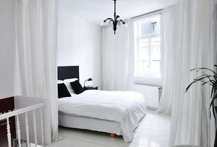 Above: A (mostly) white bedroom is partitioned off from the bath with gauzy floor-length curtains.