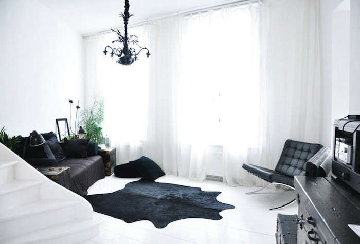 Above: In the living room, a Mies Van der Rohe Barcelona Chair in black leather upholstery ($5,271 at Design Within Reach), and black cow hide (for something similar, visit the Raw Hide Company).