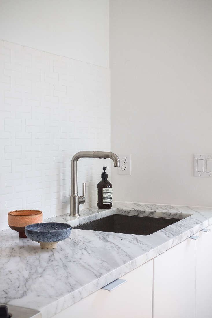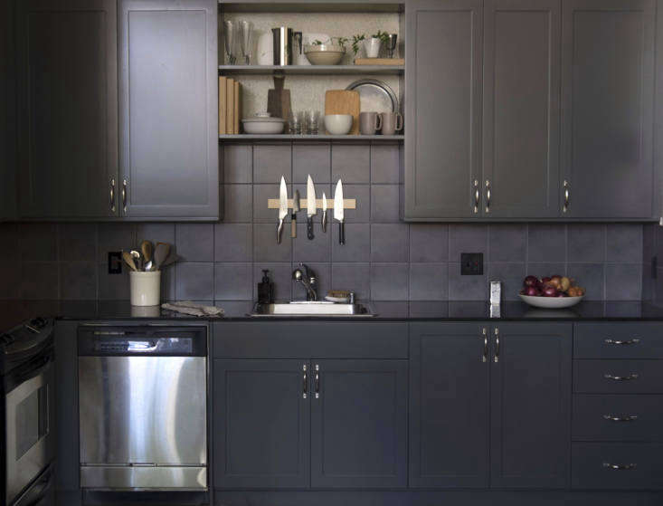 Above: After consulting with an interior designer, Meredith found a paint shade for her unsightly wood cabinets that balances out the dark-colored tile backsplash and transforms the space. Read more about how she did it in Before & After: A Remodelista Editor’s Dated California Kitchen Gets a Refresh.
