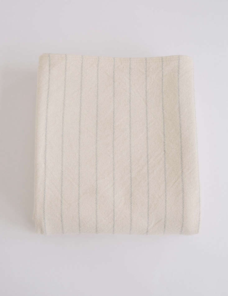 Above L: The pared-back Simple Blanket (from $264 for the twin size) is made in Maine of 100 percent cotton. Above R: The subtle Pinstripe Blanket (from $264 for the twin size), also woven in Maine, comes in three soft colors, including a light gray (shown).