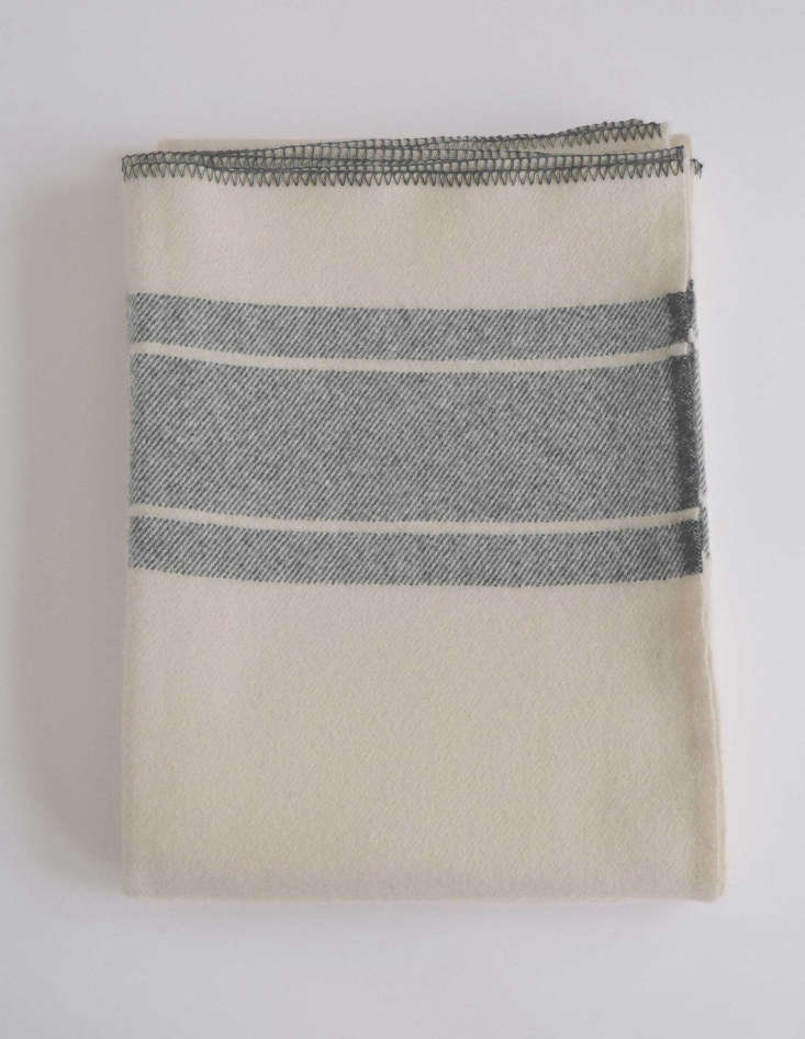 Above L: The Merino Wool Blanket ($319 for the twin size) in a plaid pattern. Above R: The same blanket in the A-Frame stripe pattern, a riff on a Maine classic. The plaid blankets are woven in Ireland, the striped ones in Maine.