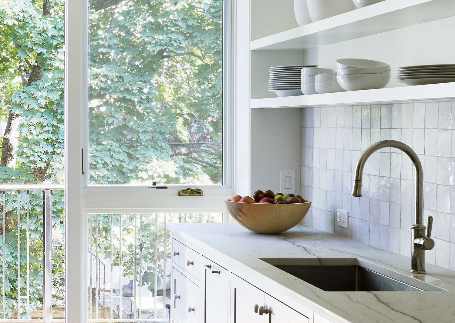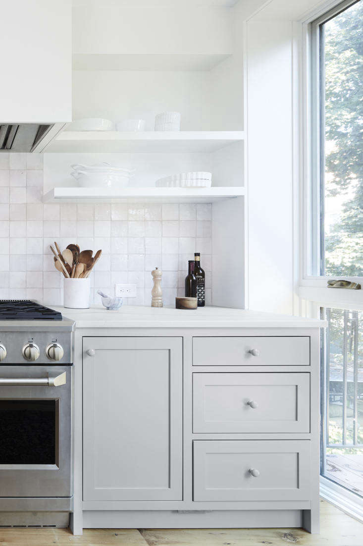 Above: The open shelving, the owners tells us, was “a gamble, because we know how easily shelves can get cluttered, but we really wanted that airy feeling. It’s been easy keeping them organized, in large part because in addition to all the storage in the kitchen, we also have the dining room sideboard.” And by displaying pieces that get used—and washed—frequently, they avoid grime buildup.,