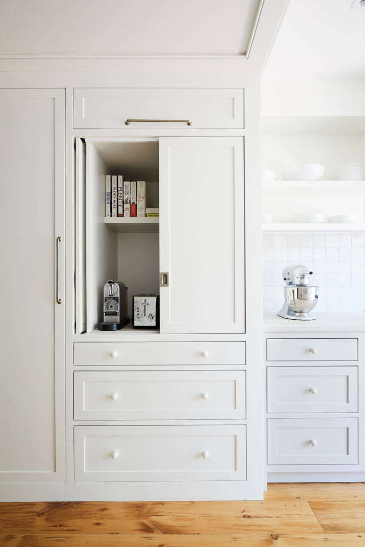 Above: The cabinets have pocket doors and plenty of space for appliances and cookbooks.  Report the owners, “Having lived in apartments with tiny kitchens, the things we craved most were storage and counter space. Pretty much every night, you’ll find one of us at the stove, the other making drinks, and our toddler running up and down the length of the house and occasionally ‘helping’ with the cooking.”