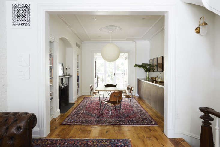 Above: The rooms are arranged enfilade: just beyond the front door, the living area opens to the dining room (with a Noguchi Akari Light over the table) and a view of the new window wall in the kitchen addition. Openings between rooms were enlarged—carefully: “the existing moldings were removed, repaired, and in some cases added onto to keep with the original detailing of the house,” says Agostinho.