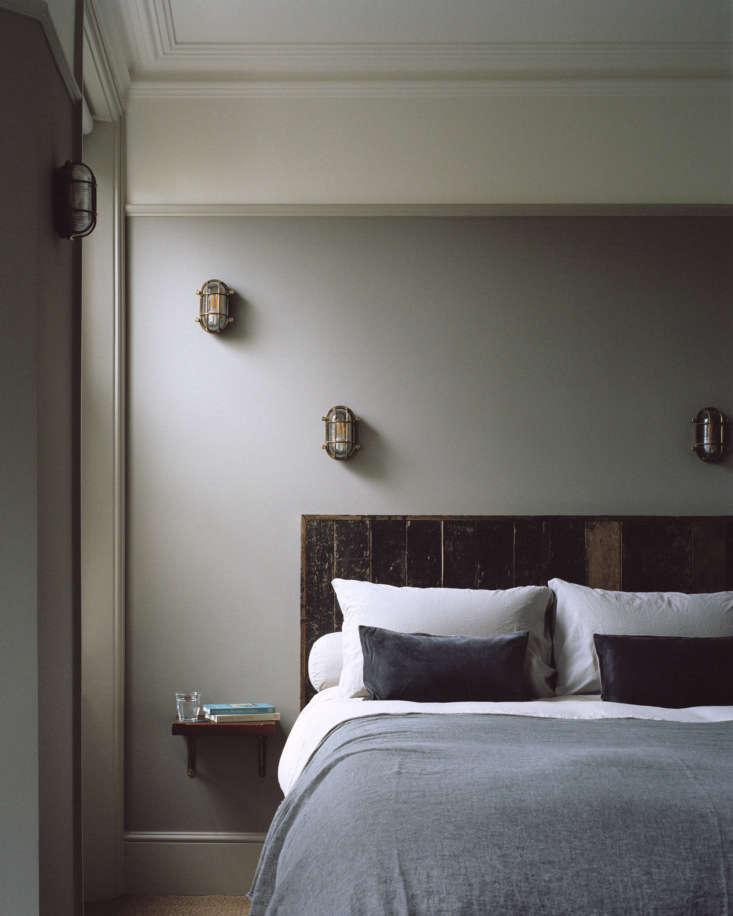 Above: Upstairs, James has a large new bedroom painted a soothing gray and lit with bulkhead lights: “I do a lot of wall lights versus a single pendant,” says Mark. “I find it much more relaxing this way than having a central light.”