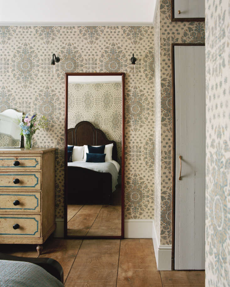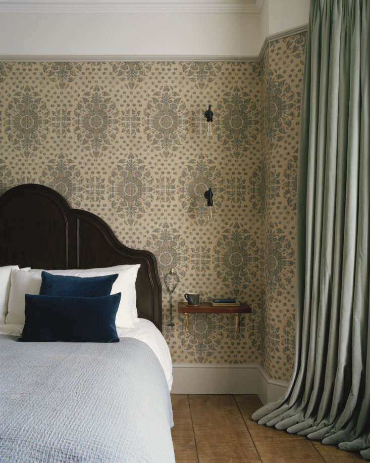 Above: Set at the Victorian front of the house on the main floor, Mark and Abi’s bedroom was given a new guise thanks to Robert Kime wallpaper in a pattern called Karabak Sand. The slim door pull is the Gareth Handle from Mark’s shop.