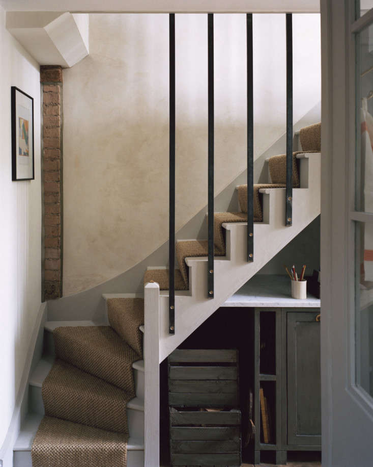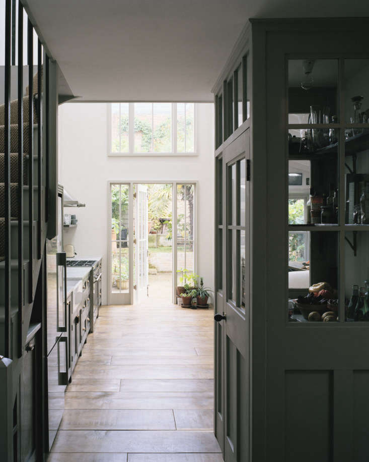 Above: Mark always designs kitchens in a single line—”when you turn a corner, they look like fitted kitchens, which feels wrong in a period house.” All of the cabinetry was built for the space and the fridge is set in a paneled box tucked under the new back stair (the existing front stair is shared with the occupants of the third floor). Note the new mezzanine on the second floor landing.