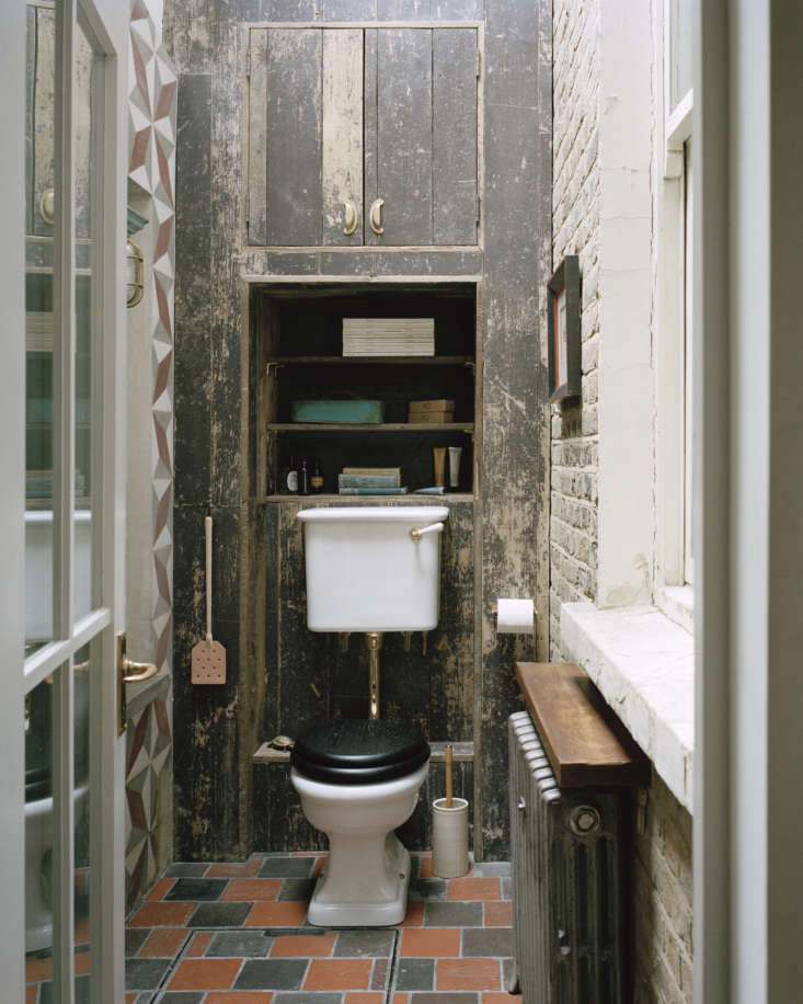 Above: The WC is a patchwork of patterns: “it’s got salvaged tiles on the floor, the house’s original brick, what had been external tiling, and the wood cladding is our old kitchen floor.”