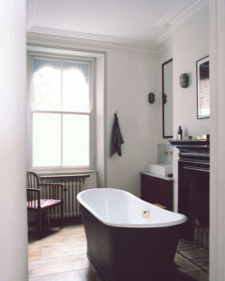 Above: The kids’ former bedroom became the parents’ en suite bath—with a working fireplace. The cast-iron tub is the Epoca from Aston Matthews. The frosted window looks into the WC.