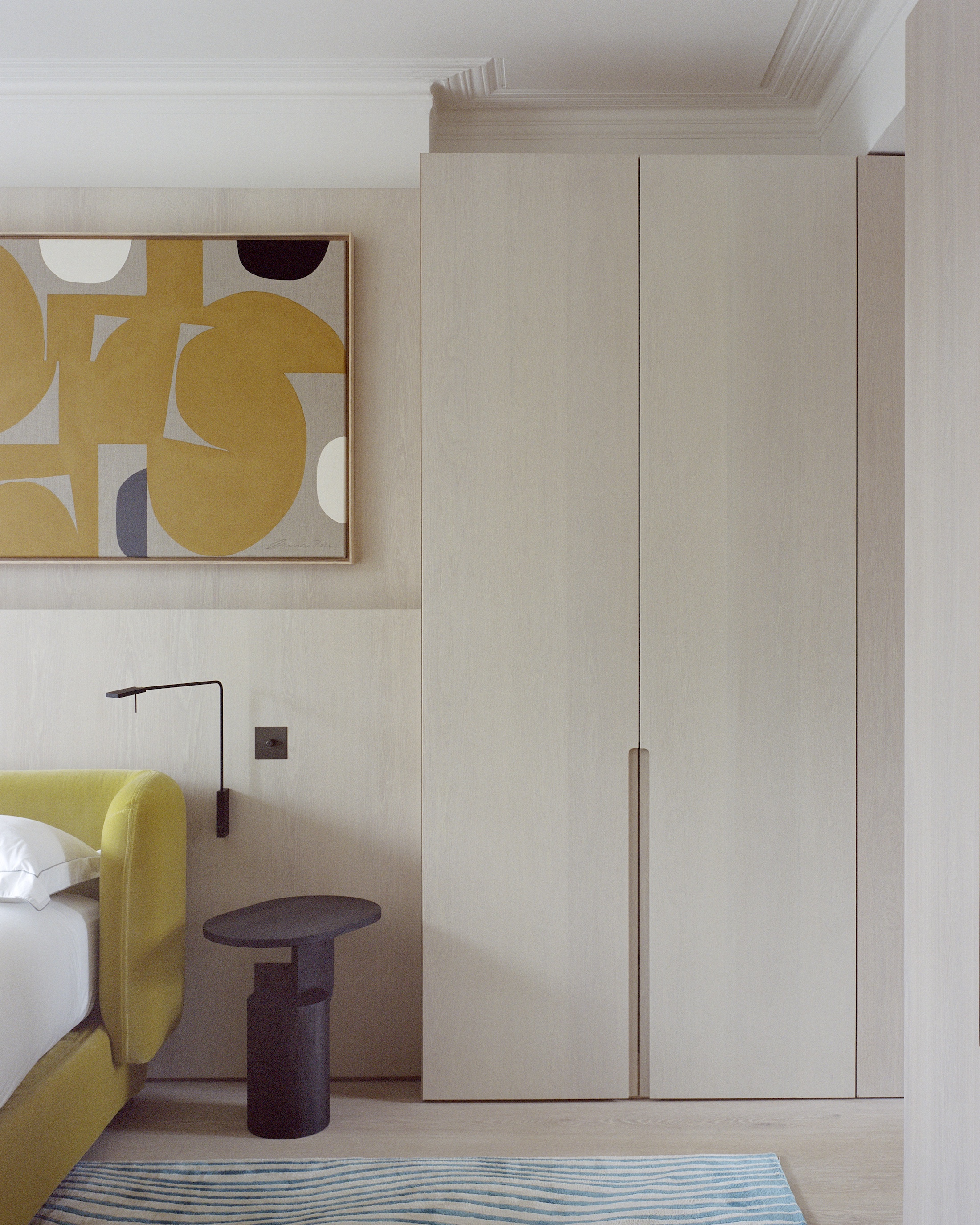 Above: A guest room has bedside Roy Wall Lamps from Italian brand Viabizzuno and Ferm Living’s stained ash Inside Side Tables.