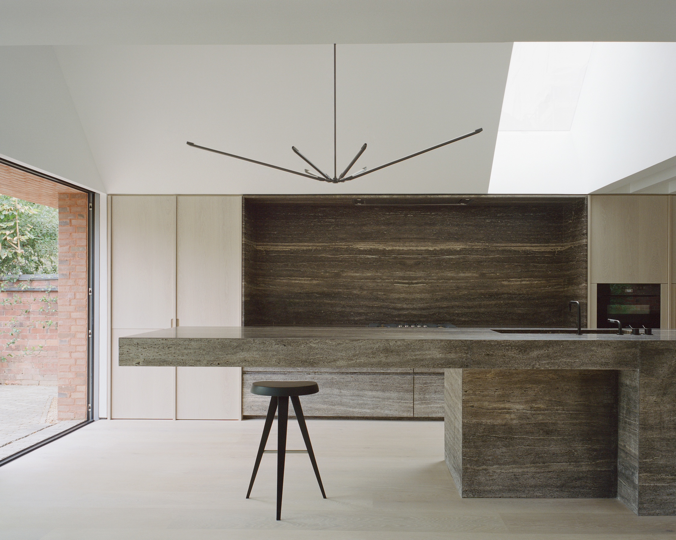 Above: The double-peaked rear extension houses the kitchen and dining area. McLaren Excell sourced reddish-pink bricks made by 200-year-old Danish brand Petersen Tegl for their similarity to the brickwork of the main house. “Lime-based Sussex Red mortar from Limetec,” they note, “lends the new structure a sense of presence and permanence while keeping it subservient to the host building.”
