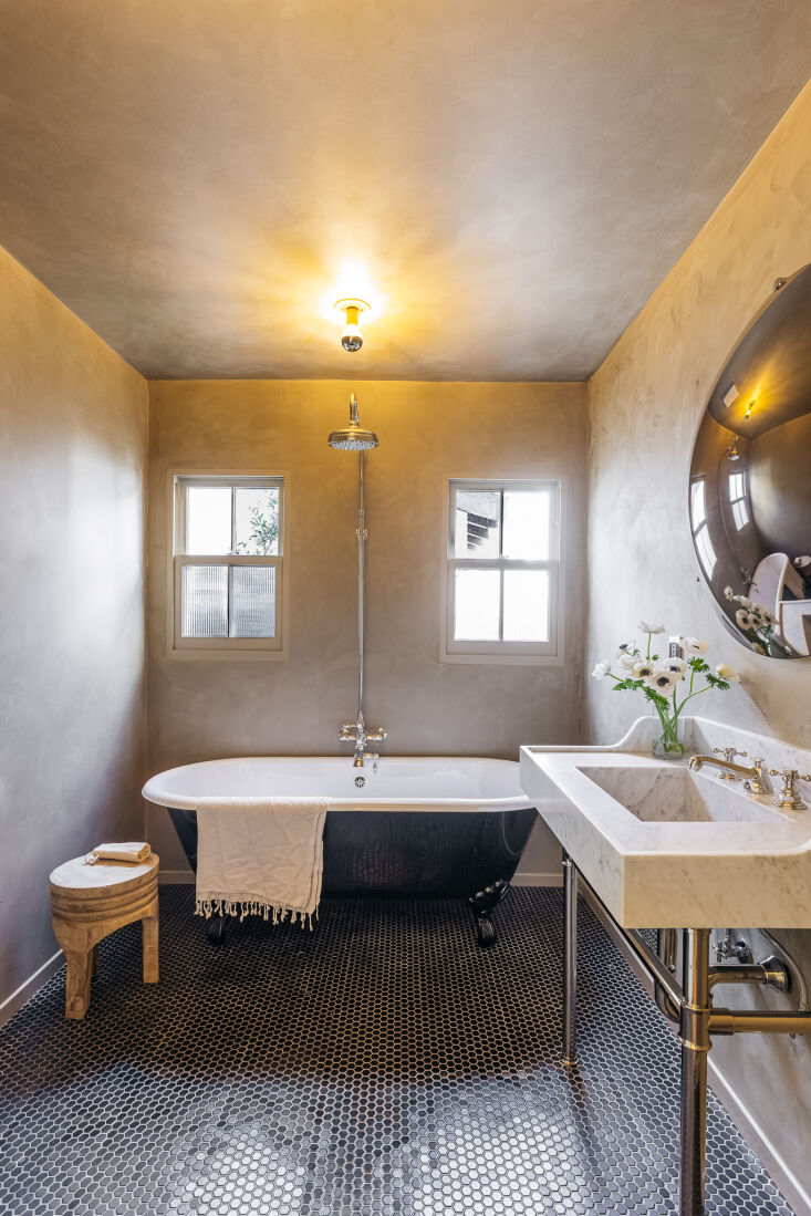 Above: One of the house’s four bathrooms. The cast-iron claw-footed tub is by Cheviot and the Vidro Convex Mirror is from CB2. The walls have a Roman clay finish (in a shade called Rustica) from Portola Paints. Photograph by Christopher Lee Foto.