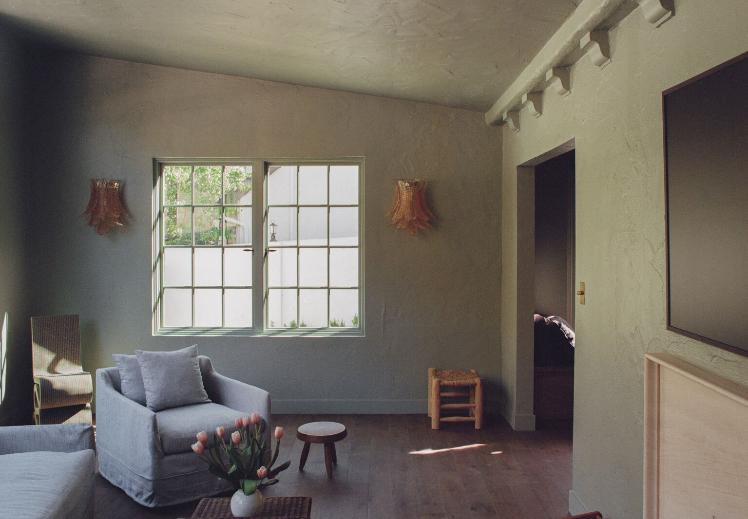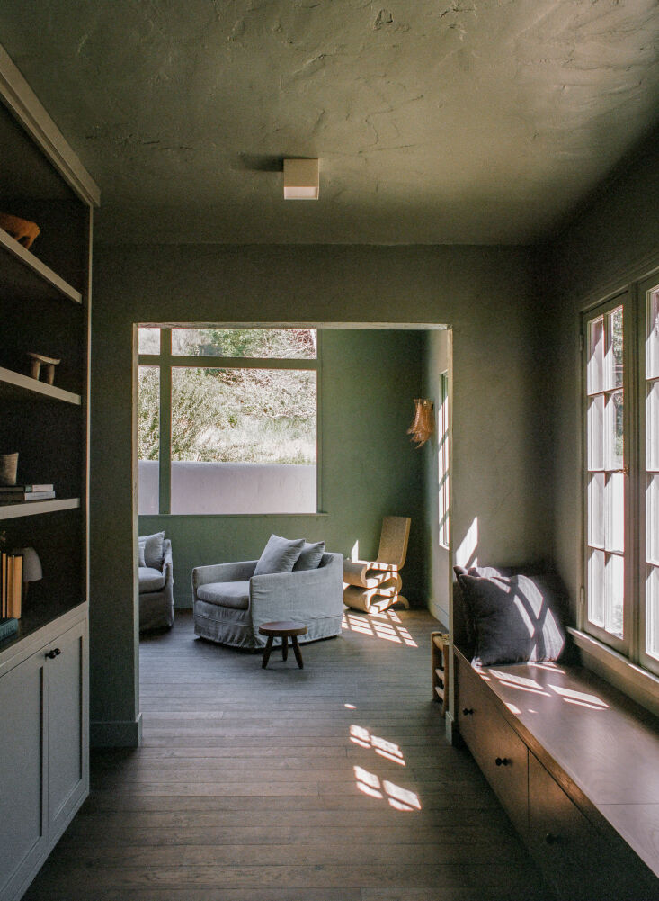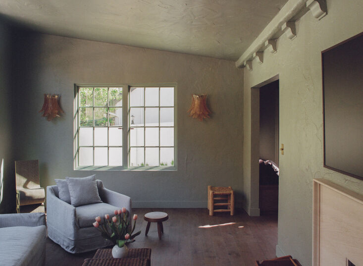 Above: The den is an addition that dates from the 1970s or ’80s—likely introduced by the owners who bought the house from St. Cyr and sold it to Ome Dezin. The beaded sconces are vintage Italian.